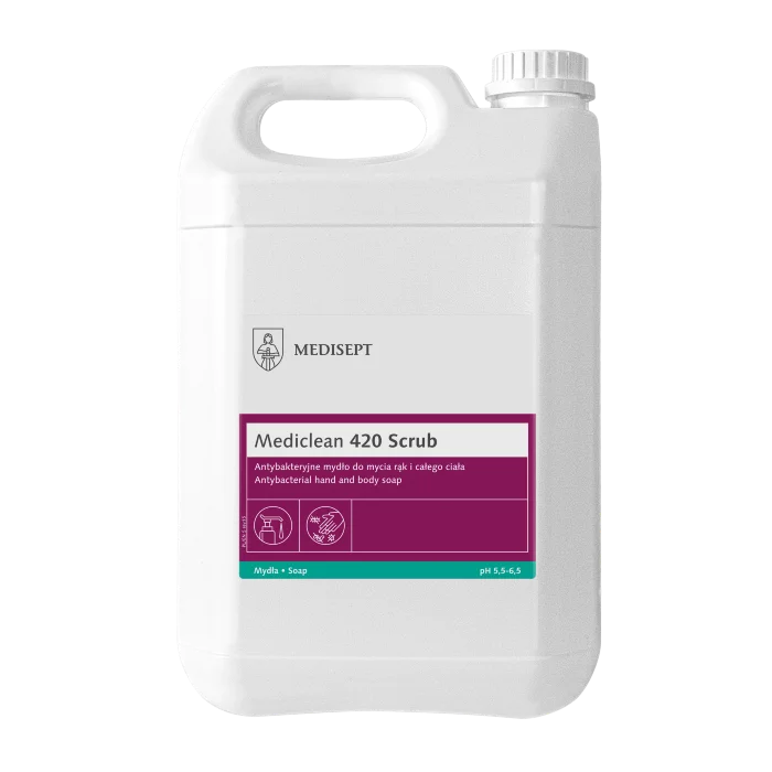 Mediclean 420 Scrub to profesjonalne mydło do rąk i ciała z drobinkami ściernymi, przeznaczone do intensywnego oczyszczania skóry. Produkt stosowany w placówkach medycznych, gabinetach kosmetycznych, salonach beauty oraz w środowiskach pracy, gdzie skóra dłoni jest narażona na silne zabrudzenia. Duża pojemność 5 litrów sprawdza się w miejscach o wysokiej częstotliwości użytkowania.